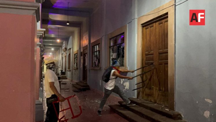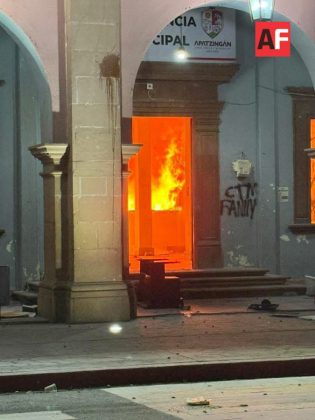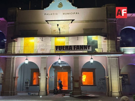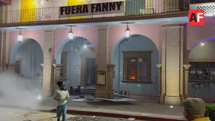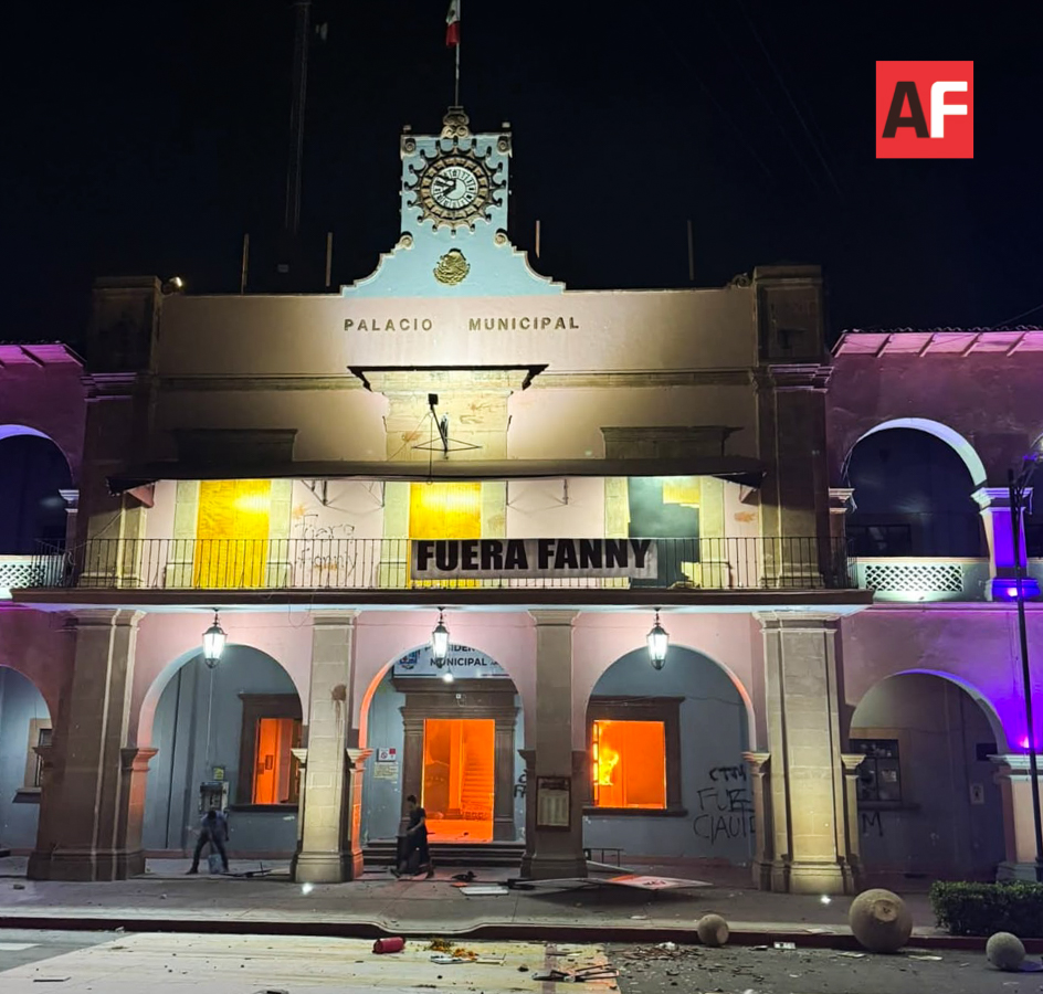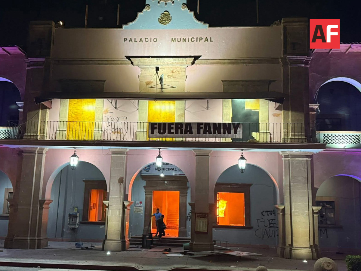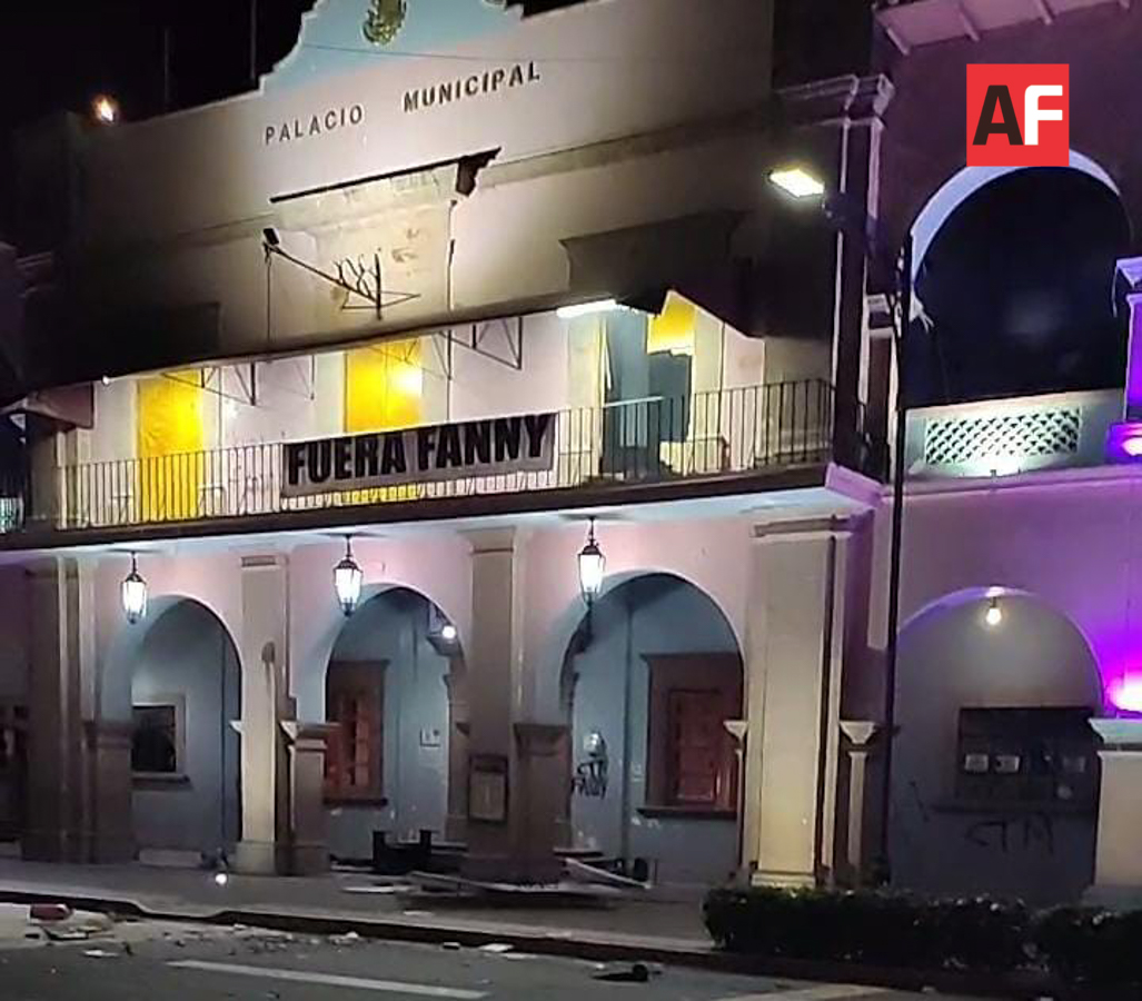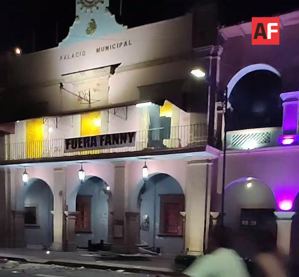 Poco después, varios encapuchados ingresaron por la fuerza a las oficinas municipales, destruyeron mobiliario y provocaron incendios en distintas áreas del recinto. En el balcón principal colocaron una manta con la frase “Fuera Fanny”.