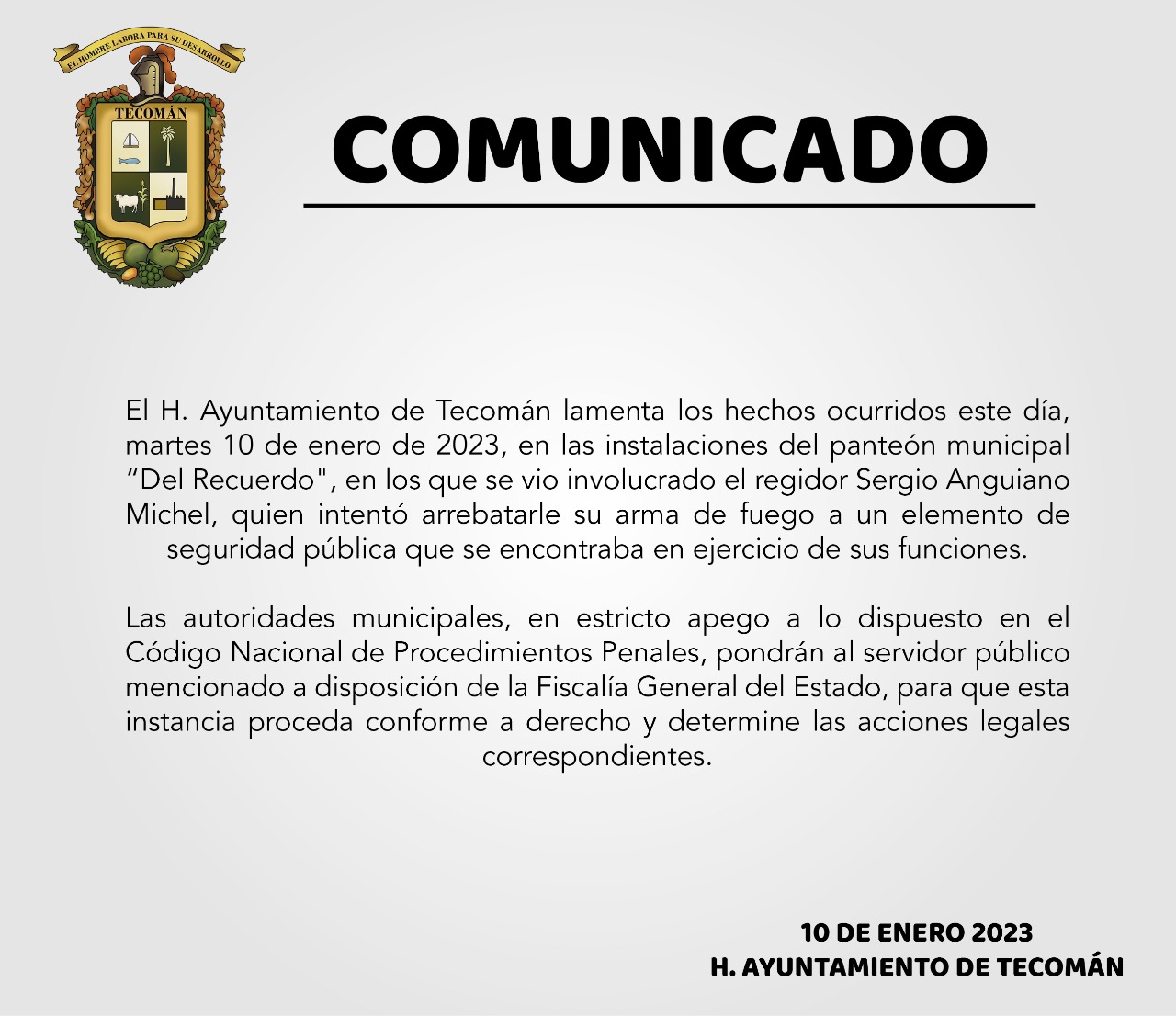 TECOMÁN.- En comunicado de prensa, el Ayuntamiento de Tecomán admitió haber arrestado al regidor Sergio Anguiano Michel, porque éste intentó arrebatarle su arma de fuego a un elemento de Seguridad Pública.