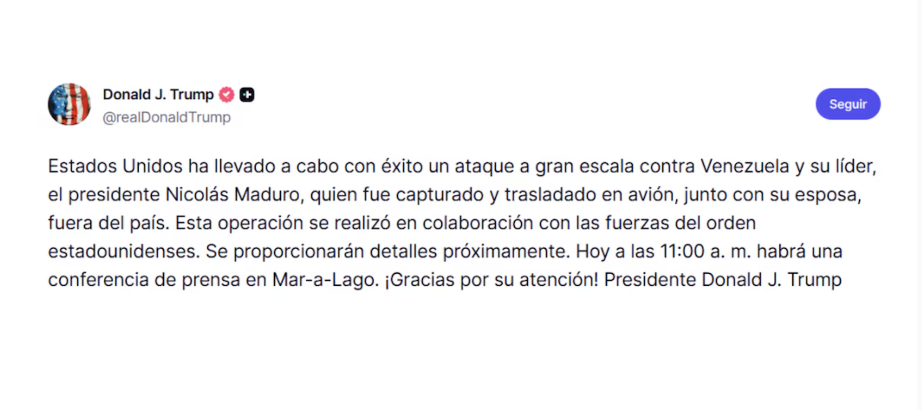 A través de un mensaje publicado en su red social Truth Social, Trump afirmó que “Estados Unidos ha llevado a cabo con éxito un ataque a gran escala contra Venezuela” y que Maduro fue capturado y trasladado en avión, junto con su esposa, fuera del territorio venezolano. Agregó que la operación se realizó en colaboración con fuerzas del orden estadounidenses y anunció que los detalles serían presentados en una conferencia de prensa programada para las 11:00 horas (16:00 GMT) en Mar-a-Lago, Florida.