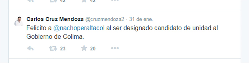 A las 22:13 publicó en Twitter: “Felicito a José Ignacio Peralta Sánchez al ser designado candidato de unidad al Gobierno de Colima”.