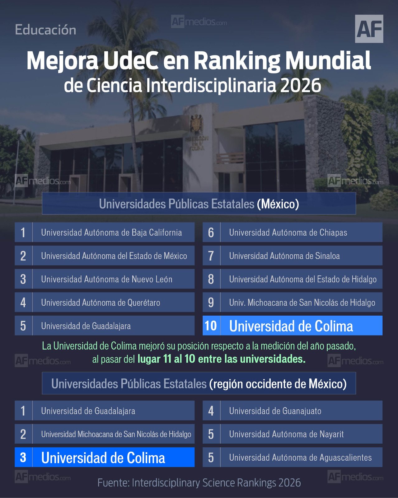 Colima.- En el Interdisciplinary Science Rankings 2026, elaborado por Times Higher Education (THE), la Universidad de Colima mejoró su posición respecto a la medición del año pasado, al pasar del lugar 11 al 10 entre las universidades públicas estatales del país en Ciencia Interdisciplinaria.
