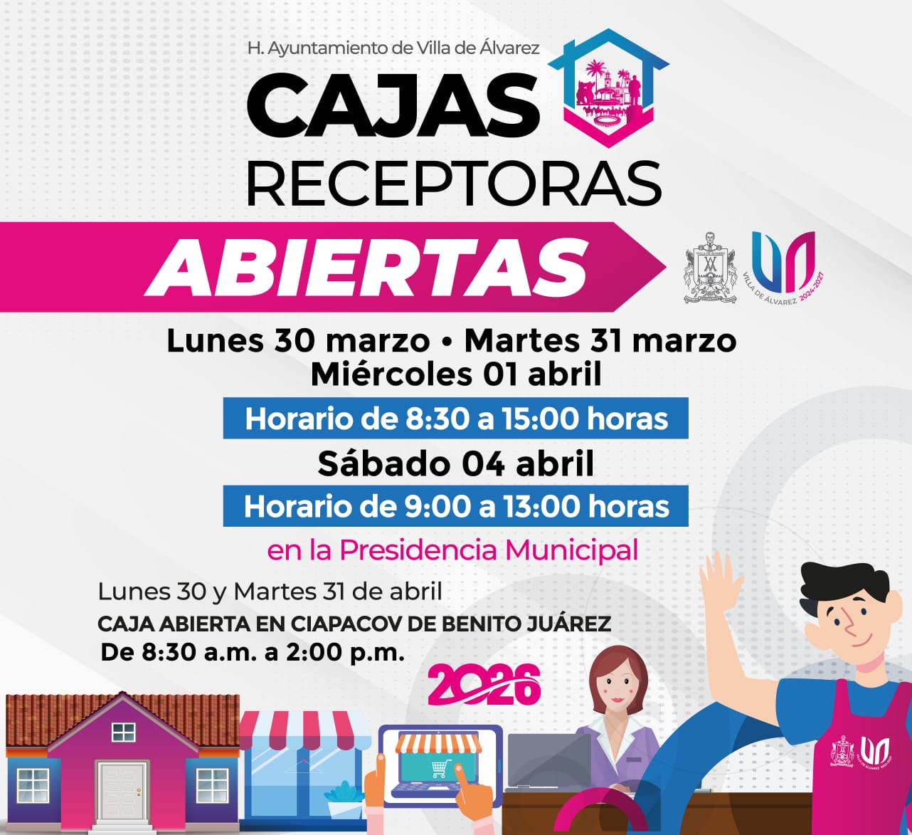 ‎También hay cajas recaudadoras del Impuesto Predial en la Presidencia Municipal de Villa de Álvarez; en las oficinas de Catastro Municipal y de Planeación y Desarrollo Municipal, en Guillermo Prieto 5, y en el Complejo de Seguridad Pública de Villa de Álvarez, en Avenida Pablo Silva 468 de la colonia Lomas del Centenario.