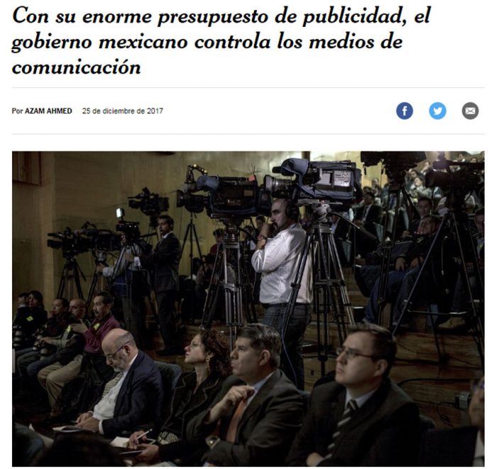 “La mayoría de los medios mexicanos han dependido de la publicidad pública durante tanto tiempo que no sobrevivirían sin los aportes del gobierno, lo que le otorga a los funcionarios una gran influencia para presionar sobre la cobertura de ciertas noticias y dejar a un lado otras informaciones, dicen los analistas, reporteros y dueños de medios.”