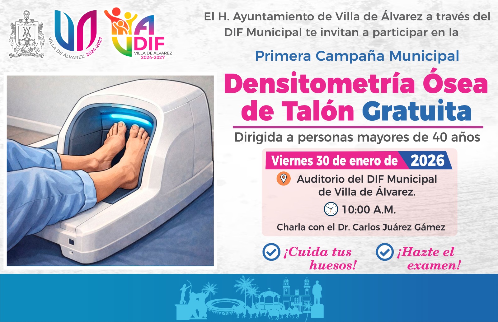 VILLA DE ÁLVAREZ.- La Presidenta Municipal de Villa de Álvarez, Tey Gutiérrez Andrade, anunció la primera Campaña Municipal Gratuita de Densitometría Ósea de Talón, procedimiento clínico para medir el grado de mineralización del hueso y detectar la probable presencia de osteoporosis.