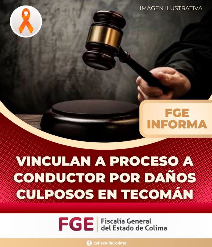 TECOMÁN.- La Fiscalía General del Estado de Colima obtuvo en audiencia inicial la vinculación a proceso de Isaías “N” por el hecho que la ley señala como delito de daños culposos, derivado de un hecho de tránsito ocurrido el 18 de mayo de 2023 en la cabecera municipal de Tecomán.