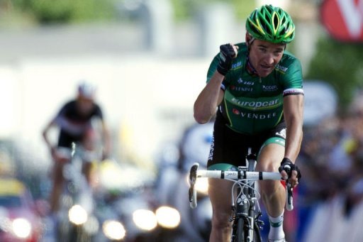 El ciclista francés Thomas Voeckler celebrando su victoria en la décima etapa del Tour de Francia, este miércoles con inicio en Macon y final en Bellegarde-sur-Valserine, en el centro-este del país. {jathumbnail off}