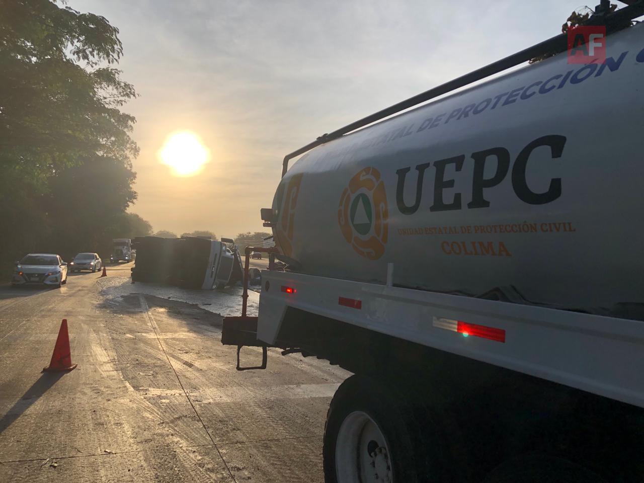 Los hechos se registraron alrededor de las 3:30 horas, cuando la unidad de carga pesada vuelca, logrando salir el conductor sin lesiones, pero registrándose el derrame de líquidos no flamables, por lo que personal de la Unidad Estatal de Protección Civil Colima acudió a realizar el lavado de la carpeta asfáltica.